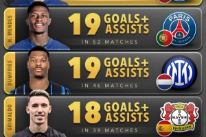 今年后卫参与进球榜:阿什拉夫21球居首,门德斯、邓弗里斯19球