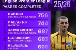 本赛季英超成功传球榜:范戴克第二,中场仅安德森、苏维门迪
