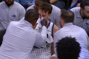 小瓦格纳争抢篮板被卡马拉肘到鼻子 血流不止下场接受治疗