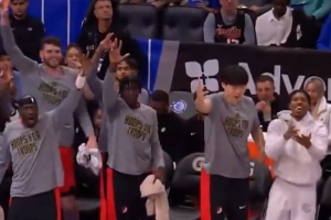 首节比赛,开拓者中锋罗伯特·威廉姆斯飚中生涯第二记三分,瀚森与替补席的队友们开心庆祝。