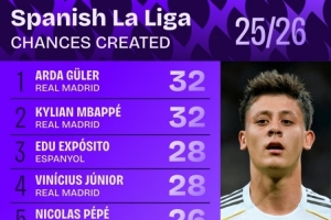 本赛季西甲创造机会次数:居莱尔、姆巴佩32次最多