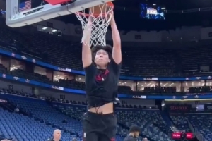 今天有机会吗?杨瀚森赛前热身秀各种扣篮 三分球也信手拈来