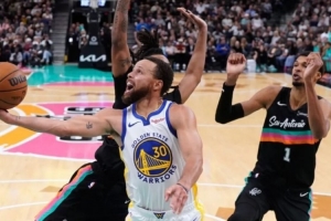 文班到三分线去追库里,被库里直穿篮下造罚球;瓦塞尔绕掩护细节不好,被库里要到三罚球:半节库里三个三分9个罚球,内外开花,马刺防守崩坏: