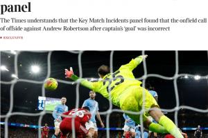 误判!泰晤士报:英超专家组裁定,范戴克对曼城进球应判有效