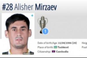 米尔扎耶夫现年29岁,司职中场,2019年1月前往柬埔寨联赛毗沙卡FC效力,已为球队出战82次,贡献5球7助攻,德转身价15万欧。根据国际足联官方消息,米尔扎耶夫的国际足联会籍已由乌兹别克斯坦转换为柬埔寨