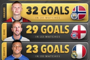 本赛季五大联赛球员进球榜:哈兰德32球居首,凯恩、姆巴佩前三