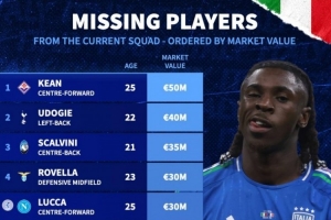 缺席本期意大利队球员身价榜:小基恩5000万欧居首 乌多吉第二