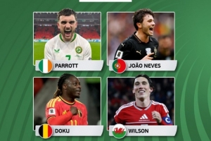 欧洲世预赛本轮最佳球员候选:帕洛特、内维斯、多库、威尔逊在列