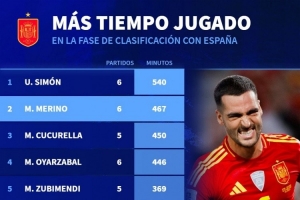 西班牙世预赛出场时间榜:西蒙540分钟居首,梅里诺467分钟次席