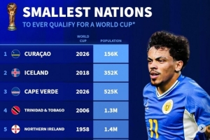 体育资讯11月20日讯 世预赛当前仅剩多个附加赛名额待定,库拉索以15.6万人成为二战之后晋级世界杯的人口最少国家,《转会市场》也统计了二战之后晋级世界杯人口最少的国家前十。