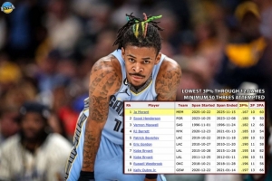 赛季至今,莫兰特出战12场,三分球60投10中,命中率只有16.7%,在NBA历史上所有赛季前12场三分出手数至少50次的球员中,这一命中率是最低的。