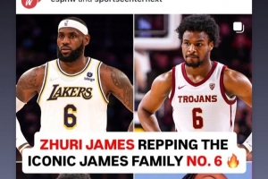 姆斯转发了媒体晒出的他和三个子女都身穿6号球衣的照片。姆斯的两个儿子布朗尼和布莱斯在大学打篮球时都身穿6号球衣,女儿Zhuri在学校打排球时身穿6号球衣。姆斯本人在热火湖人也有6个赛季身穿6号球衣。