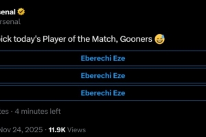 赛后阿森纳官方在社媒发布投票,评选本场最佳球员,三个选项均为上演帽子戏法的埃泽